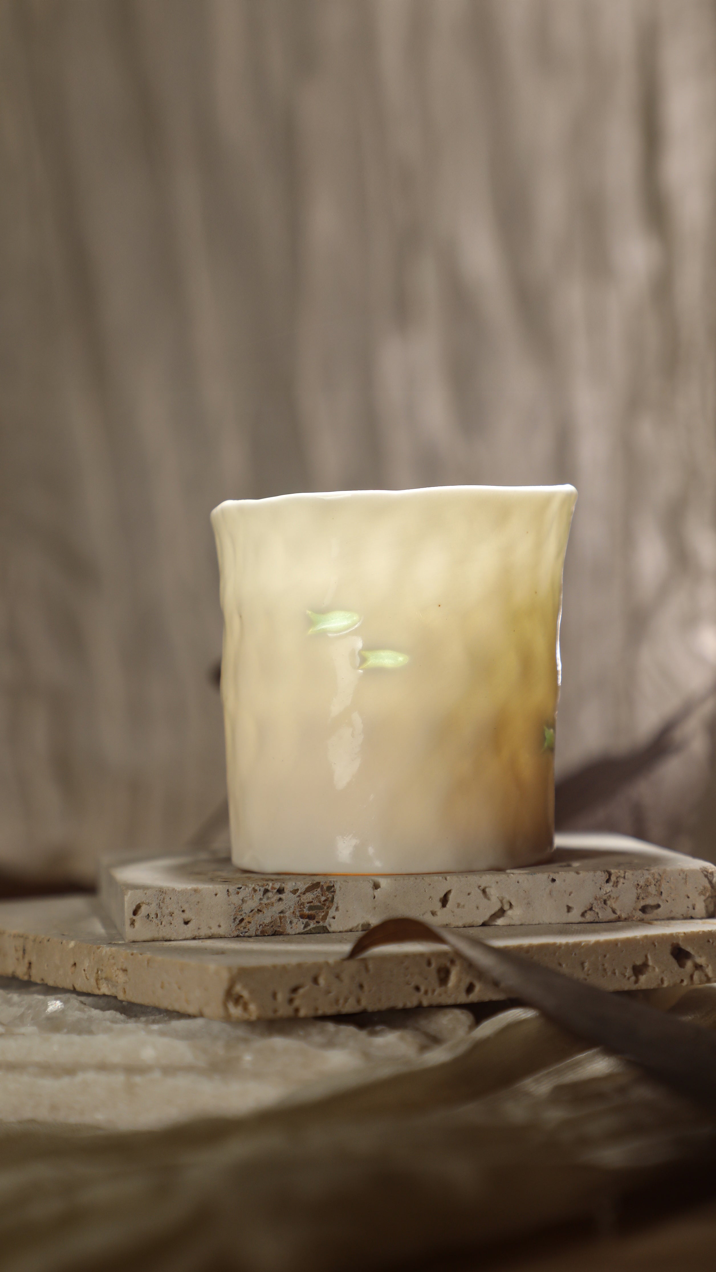Hand-pinched and hollow-carved ceramic cup, finished with a translucent “linglong”“玲珑” glaze that softly glows when held against the light.