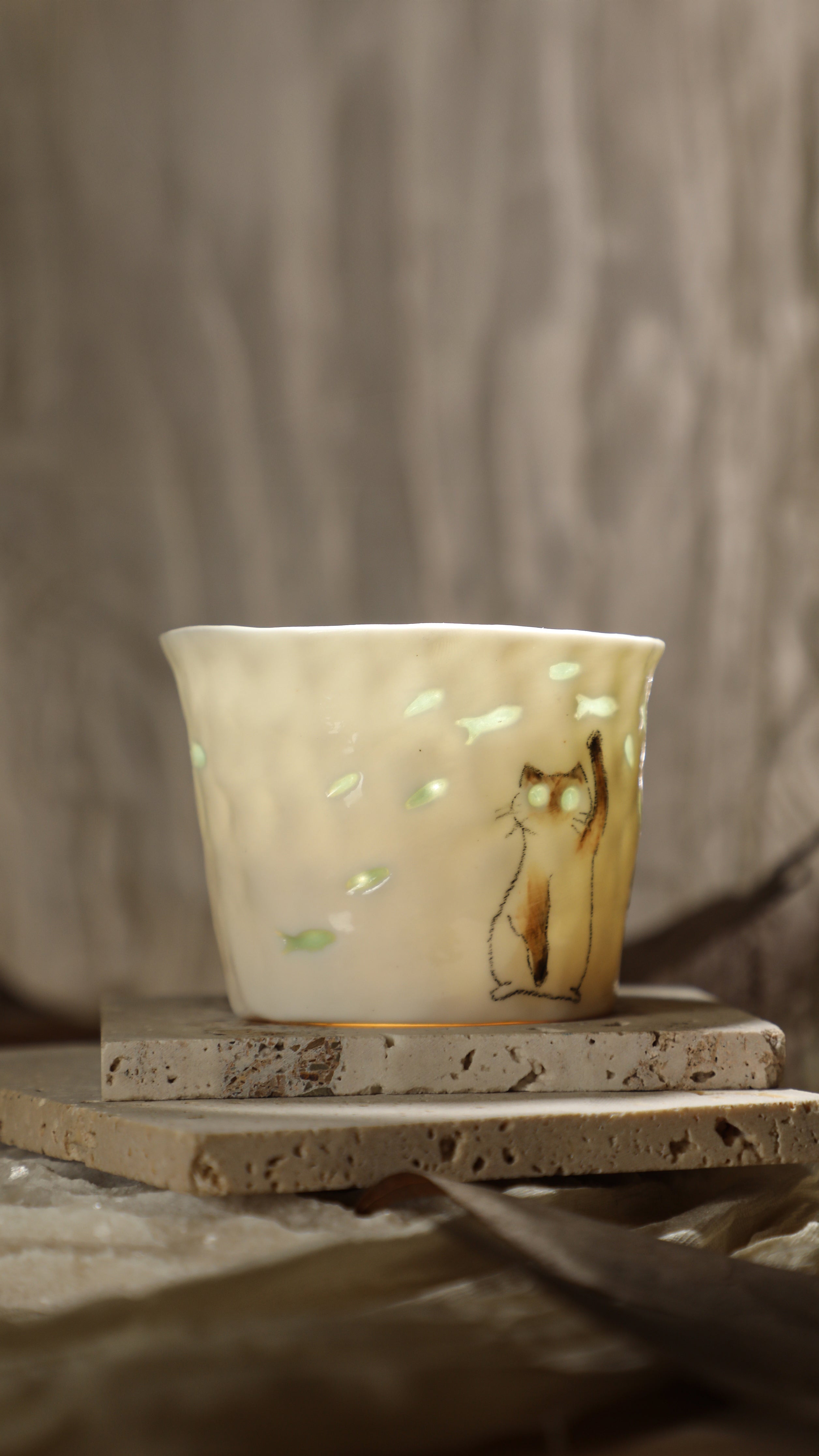 Hand-pinched and hollow-carved ceramic cup, finished with a translucent “linglong”“玲珑” glaze that softly glows when held against the light.